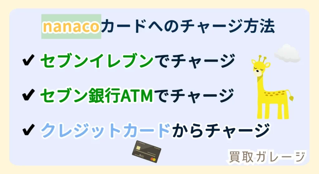 セブンイレブン、イトーヨーカドー、アリオの店頭かセブン銀行、クレジットカードを使ってオンラインでもチャージができます。